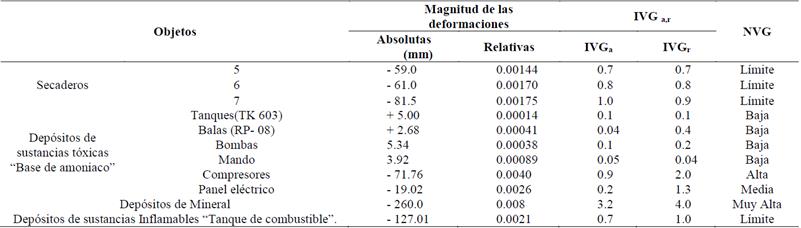 En la Base de amoniaco el nivel de vulnerabilidad en sus objetos fundamentales (tanques y balas) es baja, estos están apoyados sobre cimentaciones profundas (pilotes) [3], sin embrago, en las obras auxiliares (Casa de compresores y Panel eléctrico) tienen niveles de vulnerabilidad de alta y media respectivamente, producto del comportamiento diferencial de los asentamientos, lo que afecta su seguridad operacional teniendo en cuenta las características de esta obra donde sus objetos están unidos por interconexiones que se apoyan en cimentaciones superficiales. En el caso de los compresores han influido negativamente las vibraciones, propias de su funcionamiento, generando cargas dinámicas que inciden en el comportamiento diferencial de las deformaciones.