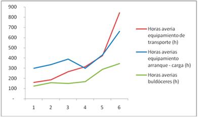 Con el paso del tiempo es inevitable el deterioro de los componentes del parque de máquinas de la mina, la disponibilidad técnica cae gradualmente debido al aumento delas interrupciones por averías, esto se muestra en la Fig. 5, donde se describen las horas anuales de averías del equipamiento de transporte, de arranque - carga y buldóceres.