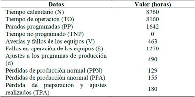 Tiempo total por paradas no programadas (TT) (ec. 5): Se obtiene sumando el total del tiempo que ha estado detenido debido a las averías y fallos de operación delas máquinas auxiliares y ajustes de los programas de producción. Se mide desde que se detecta el fallo y se para el equipo hasta que queda apto para el trabajo y es puesto en operación con los parámetros de calidad y seguridad requeridos [1].