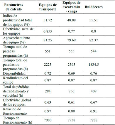 La Tabla 4 muestra los resultados del cálculo de cada uno de los parámetros claves del servicio de la mina, mientras que la Tabla 5 muestra los resultados del índice de productividad para el equipo de transporte, excavación-carga y buldóceres al 6to año de explotación.