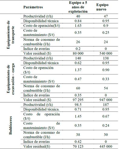 Al llegar al 5to año de operación, ya se presentan indicadores técnicos económicos desfavorables por problemas operacionales y deficiencias en el mantenimiento, lo que se traduce en unos costos operativos elevados y productividades insuficientes. En la Tabla 6 se muestra una comparación de estos indicadores que son los principales a tener en cuenta a la hora de evaluar el reemplazo de un equipo. Los resultados han sido expuestos de manera independiente para las máquinas de transporte, de arranque - carga y buldóceres, demostrando el significativo aumento de los costos de operación y la disminución de la eficiencia del equipamiento al acercarse el fin de su vida útil.