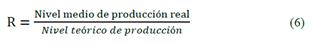 El nivel de rendimiento del equipo (R) (ec. 6) permite evaluar el funcionamiento del equipo con base en los parámetros de diseño. En ocasiones se tiene una disponibilidad técnica elevada con eficiencia muy baja, en el caso de la maquinaria minera, esto puede estar provocado por fallas de fábrica que no permiten alcanzar los estándares normales de las líneas de equipos, así, permanece disponible por el tiempo previsto pero no opera a plena capacidad o presenta consumos y desgastes muy elevados.