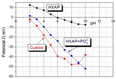 En el laboratorio de sistemas particulados del I.M CIMEX se midió el potencial Z de la fracción de cuarzo y de Hydroxilapatito. Los resultados se presentan en la Figura 6.
