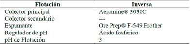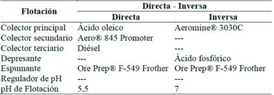 Las concentraciones de reactivos en la flotación directa-inversa fueron las siguientes: Colector ácido oleico (577 gr/ton), Aero® 845 Promoter (535gr/ton) y diésel (488 gr/ton) en el proceso aniónico; y Colector Aeromine® 3030C (1572 gr/ton) y depresante ácido fosfórico (618 gr/ton) en el proceso catiónico. La concentración de espumante fue de 188 gr/ton de Ore Prep® F-549 Frother para ambas etapas de la flotación.