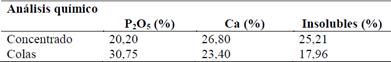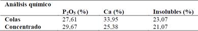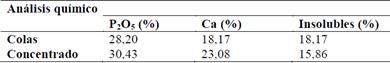 Para el análisis químico se disuelve el mineral del concentrado y el precipitado en ácido clorhídrico (HCL) y se determinaron los porcentajes de P2O5, Ca e insolubles presentes por medio de colorimetría y espectrofotometría de absorción atómica, respectivamente.