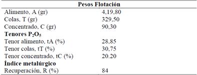flotación de minerales, rocas fosfóricas, recuperación, apatito, índices metalúrgicos.Abstract