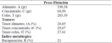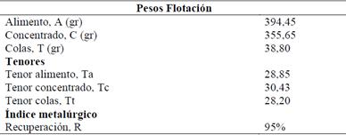 Los resultados de la flotación directa se describen mediante el cálculo de los elementos por análisis químico y el cálculo de la recuperación según los pesos y tenores como se describen en las Tabla 7 y 8.