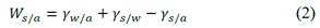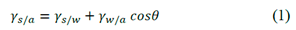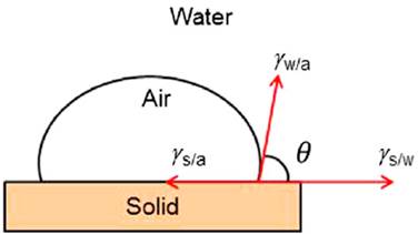 Donde γ s/a , 𝛾 𝑠/𝑤 y 𝛾 𝑤/𝑎 son las superficies de las tensiones (o energías) entre el sólido y el aire, el sólido y el agua, y el agua y el aire, respectivamente. Y θ es el ángulo de contacto en donde coexisten las tres fases, agua, aire y sólido. El trabajo requerido para romper la interface entre partícula-burbuja es llamado trabajo de adhesión ( W s/a ) y está dado por la ecuación [11]:
