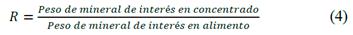 Donde C es el peso del concentrado, tc es el tenor del concentrado, A es el peso del alimento y ta es el tenor del alimento [13]: