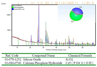 La composición química de la muestra se realizó por medio de Difracción de Rayos X (DRX) y se clasificó como un Hydroxilapatito con cuarzo (ver Fig. 3).