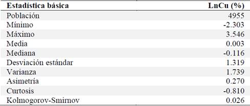 La Tabla 1 muestra la estadística descriptiva de los valores de Cu. Se puede observar que la media y la mediana presentan valores muy diferentes y muy pequeños con relación al valor máximo, el coeficiente de variación es mayor que 1. Por lo que se puede inferir que la distribución de los contenidos de Cu es asimétrica, lo cual puede ser observado en el histograma, Fig. 4. El valor de la prueba de normalidad Kolmogorov-Smirnov es de 0.265, el cual es mayor que 0.05 Los resultados muestran un comportamiento no normal de los valores de Cu. Por esta razón los procedimientos de la Geoestadística lineal, Krigeado Simple o Krigeado Ordinario no pueden ser aplicados, es más apropiado usar métodos no lineales de la Geoestadística [13; 12; 23].