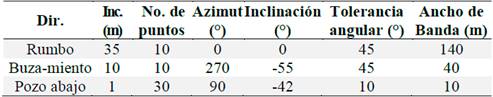 La distancia entre las localizaciones más alejadas por el rumbo es de 650 m, 230 m por le buzamiento y 60 en la dirección vertical. Los parámetros para el cálculo del semivariograma se presentan en la Tabla 3. En todas las direcciones, la variabilidad fue estudiada hasta aproximadamente la mitad de la distancian máxima.