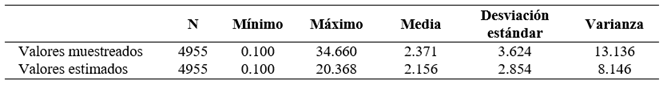 La Tabla 5 muestra la estadística básica entre los contenidos originales y estimados después de la transformación inversa. Los valores medios son próximos. La varianza tiene valores adecuados, en correspondencia con las características de suavizado de los métodos de interpolación. No se obtuvieron valores extremos en la estimación. Otra variante a emplear cuando la trasformación logarítmica no garantiza la estacionaridad necesaria es el Krigeado Multigaussiano.