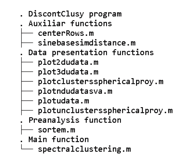 El núcleo principal del programa DiscontClust (i.e. mainToolBox) está compuesto por diez funciones procedimentales, de las cuales seis se usan para presentar los datos (data presentation functions), una para preparar los datos antes del análisis (preanalysis function), dos funciones que realizan tareas independientes (auxiliar functions) al ser llamado por una sola función principal (main function) que realiza el cálculo de agrupación; tal como se muestra en el listado de las funciones del programa en la Figura 1.