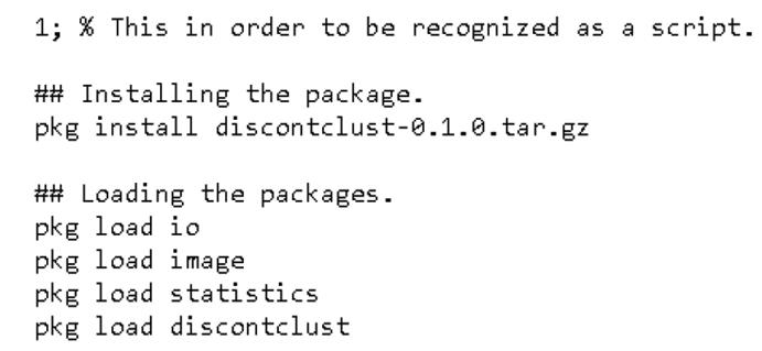 Para facilidad del usuario de DiscontClust todos estos archivos se han puesto en un paquete de instalación (llamado en Octave package y conocido con la sigla pkg.