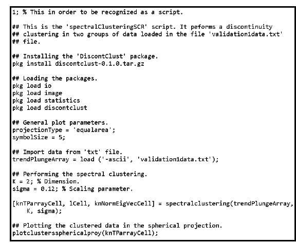 Con el comentario Performing the spectral clustering se inicia el bloque para hacer el proceso de agrupamiento automático. Las dos primeras líneas definen el número de familias que se quiere encontrar con el algoritmo (que en este caso dice que serán dos) y asigna el valor de 𝜎 igual a 0.12. La tercera línea (la más importante) llama para hacer correr la función spectralclustering dando como variables de entrada: los datos de las orientaciones de las discontinuidades, el valor del número de familias y el valor de sigma previamente asignados. El resultado se almacena en una variable llamada knTParrayCell.