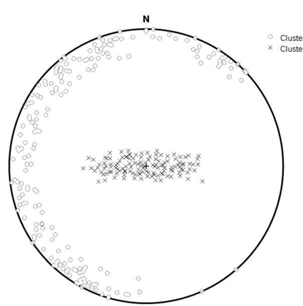 Figura 6. : Diagrama esférico equiárea de la orientación de las discontinuidades, donde se diferencian dos familias a partir de la agrupación automática usando el programa DiscontClust.