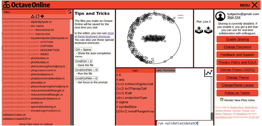 Esta validación (y cualquiera de las siguientes, más los ejemplos) se puede hacer correr en la nube ingresando a un desarrollo en línea de Octave en la página web https://octave-online.net/. Para ello debe crear una cuenta personal, dentro de ella subir los archivos discontclust−0.1.0.tar.gz, validation1data.txt y validation1dataSCR.m para finalmente hacer correr el archivo de lotes escribiendo en la terminal simplemente run validation1dataSCR. La Fig. 7 muestra el entorno gráfico de esta aplicación en la nube, donde se hizo correr el archivo de lotes de esta validación.