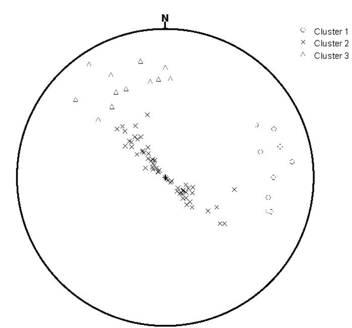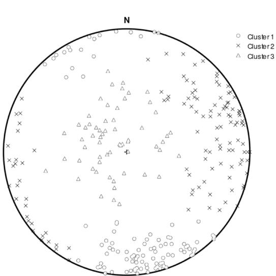 Figura 8. : Diagrama esférico equiárea de la orientación de las discontinuidades, donde se diferencian tres familias a partir de la agrupación automática usando el programa DiscontClust.
