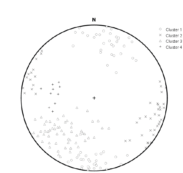 La Fig. 11 muestra el diagrama esférico equiárea del proceso de agrupación a cuatro familias de los mismo datos.