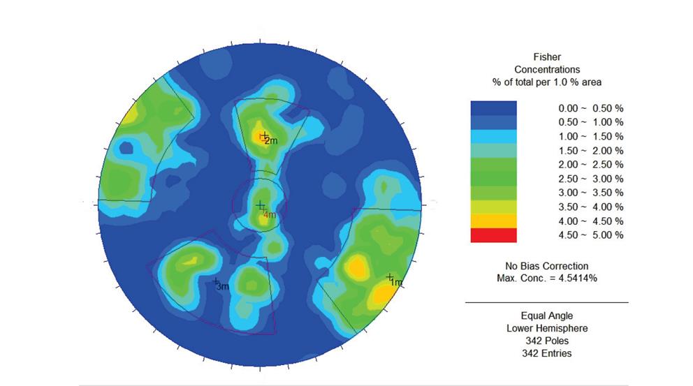 Con esos datos, Suarez-Burgoa (2008) [5] elaboró un diagrama de concentraciones de polos (mostrado en proyección equiangular) y a criterio heurístico se encontraron cuatro familias de discontinuidades agrupadas en tres ventanas rectangulares y una ventana circular, tal como se muestra en la Fig. 12. Esta es la práctica habitual en la actualidad por la carencia de una herramienta separada de distribución libre que posibilite la selección automática como la que se expone en este texto.