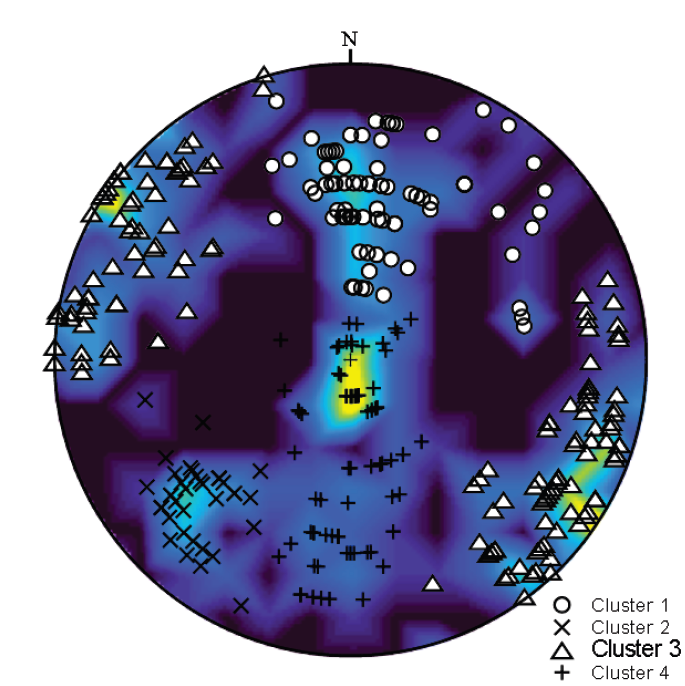 Con el programa DiscontClust se encontraron también cuatro familias, pero dos de ellas se alejan del criterio de selección actual. La Fig. 13 muestra los resultados del proceso de agrupación de familias (encontrada con este programa) puesto encima de la imagen del diagrama de concentraciones de polos (obtenida con el programa BuzyPlus), aquel mencionado en el estudio (esta vez es una proyección equiárea porque el programa DiscontClust en su versión reducida limita solo a esta proyección).