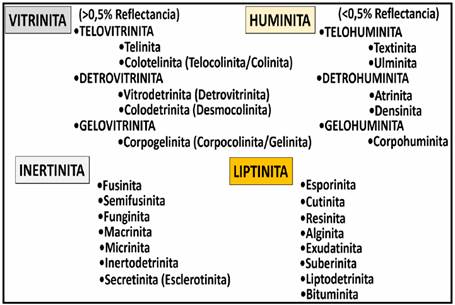 Figura 7: Tipos de Macerales y grupos Sub-Macerales donde se detalla la diferencia termal entre la Vitrinita y la Huminita.