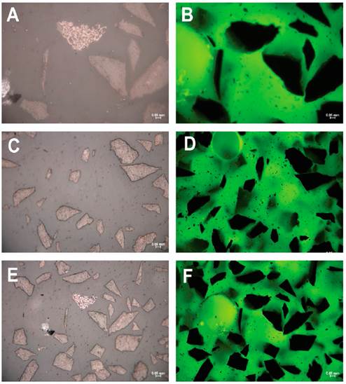 En los otros apartados (Ver Fig. 9 secciones A,C,E) se visualizan fragmentos de Vitrinita 95%, la cual evidencia un color gris en luz reflejada, bordes rectos y ausencia de estructuras de tallo presentando una forma gelificada y masiva; propiedades comunes de la variedad Colotelinita dichos fragmentos no poseen fluorescencia como se muestra en los apartados B,D,F y es el maceral más abundante en la sección.