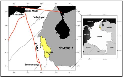 Figura 1: Localización de la cuenca del Catatumbo en la cordillera oriental con incidencia del sistema de fallas de Bucaramanga-Santa Marta (B.S.M.F)