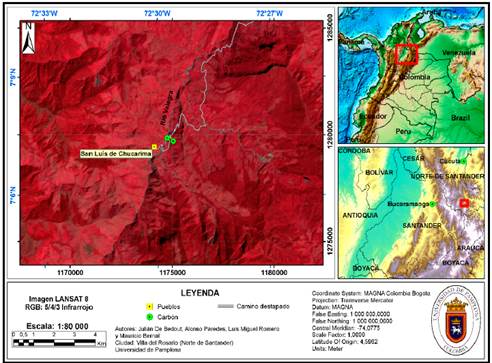 Figura 2: Ubicación del área de estudio, vista desde el cruce de bandas Landsat 8 en donde los colores marrones a morados representan bajo índice de vegetación y los colores rojos en intensidad representan un índice de vegetación alto.