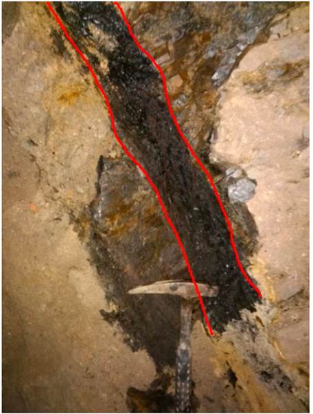 Figura 4: Manto de carbón de la Mina la Lomita de San Bernardo de Bata con un espesor de 0,15m en contacto con arenitas de grano medio.