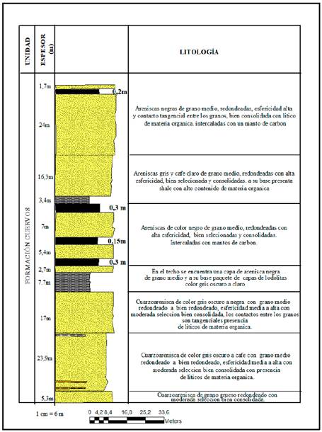 La formación Cuervos en el sector del corregimiento de San Bernardo de Bata es de 340m el cual es donde se localiza el área de estudio (Ver Fig. 2). Esta unidad se correlaciona con las partes superiores de las formaciones Lisama del Valle Medio del Magdalena y Angostura, Marcelina y Trujillo, en Venezuela [18].