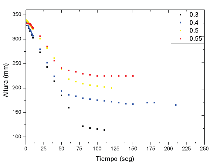 Las velocidades de sedimentación se describen en la Tabla 1. El cálculo de la velocidad de sedimentación de las partículas se realiza por medio del cálculo de la pendiente de la parte lineal de las pruebas de sedimentación, dicho cálculo se realiza por medio de una regresión lineal de la Fig. 7. La regresión se realiza en el Software Origin Lab.