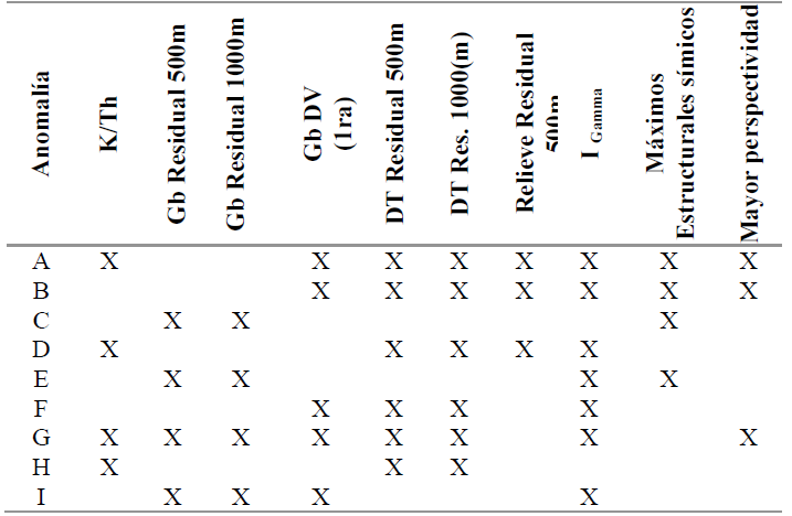 A partir de la interpretación realizada a los mapas resultantes del procesamiento del campo gravitatorio, magnético, de espectrometría gamma aérea y el modelo digital de elevación de 90x90m; se determinaron anomalías, las cuales se encuentran descritas en el epígrafe anterior. La coincidencia espacial de las mismas, teniendo en cuenta el comportamiento que presentaron en el yacimiento de Motembo (máximo gravimétrico determinado a partir de la derivada vertical de primer orden y de la residual a 500 y 1000m, máximo del campo magnético reducido al polo, así como sus residuales 500 y 1000m, un mínimo rodeado de máximos de la relación potasio-torio, un máximo de la intensidad gamma total, un máximo de uranio y un máximo de la residual del modelo digital de elevaciones a 500m) localizado cerca de la zona de estudio, fue representado en un mapa de anomalías complejas Fig. 14, recogidas también en la Tabla 1.