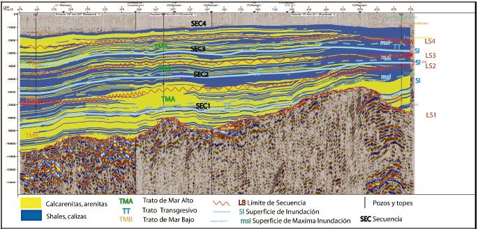 Figura 7: Definición de las secuencias deposicionales, resultado de la integración de la interpretación de pozos y la sismoestratigrafía.