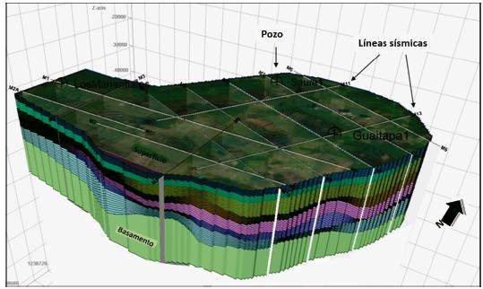 Debido a la baja calidad de las líneas sísmicas se dificultó la definición de los horizontes, los cuales se trazaron con incertidumbre en algunas de las líneas sísmicas. Para la interpretación final del modelo se empleó la línea 01, dispuesta E-W, amarrada a profundidad con el pozo Well-1, presentando una estructura general del área.