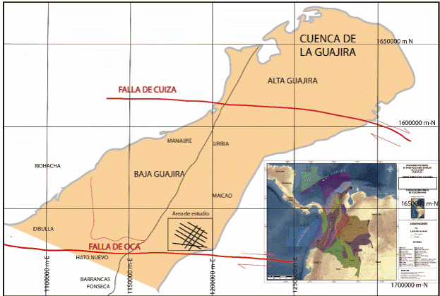 La zona de estudio se encuentra ubicada en el sureste de la Península de la Guajira, en cercanías al área de Maicao (Fig 1). Hace parte de Sub-Cuenca de la Baja Guajira [6]. cuyos límites están constituidos por el sistema de fallas de Cuiza al norte, la Falla de Oca al sur, el Mar Caribe al Oeste y el Golfo de Venezuela al Este [7].