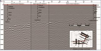 Acorde a los registros de pozo, se continúa con la interpretación de los diferentes horizontes en las líneas sísmicas (Figs. 4 y 5), asociados a las superficies estratigráficas interpretadas.