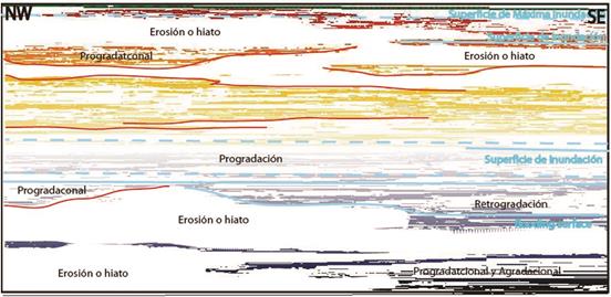En este trabajo se toman como referencia principal conceptos estratigráficos actuales [4], para la definición y determinación de superficies claves (superficie de inundación inundación máxima, sim; discordancias e inundación), Tratos de Sistema a partir del reconocimiento de patrones de apilamiento específicos. Estos Tratos de Sistema definen, “unidades estratigráficas relacionadas genéticamente [5], que incorporan estratos depositados dentro de un sistema de dispersión sincrónico”, los cuales pueden ser asignados a una posición particular en la curva del nivel base en la línea de costa. Como complemento, es importante la determinación de superficies estratigráficas que marcan cambios a través del tiempo en los regímenes deposicionales, creadas por la interacción entre el nivel base y la sedimentación.