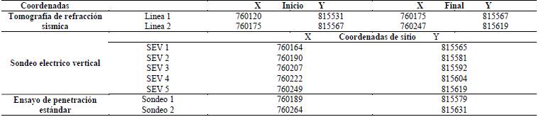 Tabla 1: Coordenadas punto inicial y final de líneas sísmicas, sondeos eléctricos verticales y ensayos de penetración estándar