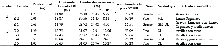 En el ensayo de SPT se realizaron dos sondeos a lo largo de la línea vial, gracias a los ensayos realizados en el laboratorio y los demás análisis correspondientes se logró encontrar materiales como Limo Inorgánico y Arcilla con Arena.