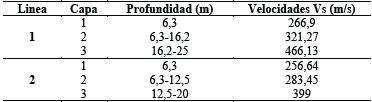 Los modelos finales se observan en la Fig. 11a, se muestran velocidades entre 267 m/s y 466 m/s de la línea 1 y una profundidad máxima de 25 m. En la Fig. 11b, se muestran velocidades entre 257 m/s y 399 m/s en la línea 2 y una profundidad máxima de 20 m. En la Tabla 3 se muestran los rangos de cada línea sísmica