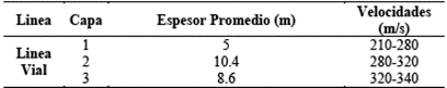 Línea 1: Se identifican 3 capas, la primera capa presenta unos contrastes de velocidades con un promedio entre ellas de 266.90m/s, con esta se clasifica un perfil de suelo Tipo D con una profundidad de 6.3m, la segunda capa tiene una velocidad promedio de 321.27 m/s con la cual se clasifica un perfil de suelo tipo D, con una profundidad que oscila entre 6.3m hasta 16.2m, en la tercera capa se obtiene una velocidad promedio de 466,113 m/s y se clasifica un perfil de suelo tipo C, con una profundidad de 16.2m hasta 25m.