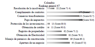 Como se puede observar en las Tabla 1 y Tabla 3 Colombia presenta una puntuación en el DB de 70,1, indicando que la economía del país se encuentra a 29,9 puntos porcentuales de distancia del mejor desempeño o rendimiento en términos de facilidad para hacer negocios, es una buena puntuación; sin embargo, hay áreas particulares donde la economía colombiana presenta un desempeño bajo, como el caso de pago de impuestos y comercio transfronterizo, que deben ser revisados y mejorados. De la Tabla 3 también se observa que Colombia tiene una buena clasificación en cuanto a el área de resolución de insolvencia y esto se debe a que Colombia simplificó el proceso de resolución de la insolvencia incrementando la participación de los acreedores en los procedimientos de insolvencia.