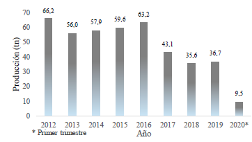 Los datos reportados expresan que la producción de oro es muy variable. En el 2012 se presenta la cifra récord histórica de producción con 66.22 toneladas y en el 2019 se situó en 36.68 toneladas de oro.