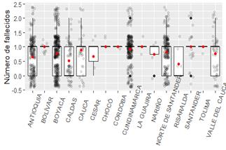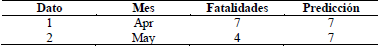 El anterior ejercicio se realizó a través del software R. Posteriormente, se propusieron algunos modelos estadísticos, entre estos usamos: modelo lineal, modelo lineal generalizado y árboles de regresión; modelos que nos permitirían establecer el número de emergencias y fatalidades ocurridas en un periodo de tiempo (ya transcurrido), para finalmente evaluar el grado de predicción de los modelos usados.