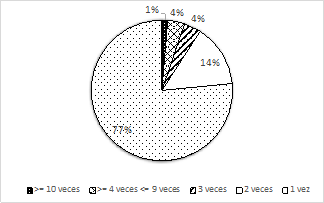En cuanto al número de repeticiones de una emergencia minera en un mismo título minero a lo largo de 14 años en que se analizó esta información, no se tienen los elementos, ni la información suficiente que nos permitan identificar las razones por las cuales se está ocasionando que un evento se repita, lo que si queda claro, es que la autoridad minera deberá realizar un trato diferencial, en cuanto a priorización de visitas de fiscalización, apoyo técnico, capacitaciones y demás estrategias que permitan evitar una nueva ocurrencia de una emergencia minera. En la Fig. 8, se evidencia que el 77% de los eventos ocurridos durante 2005 a 2019 ocurrieron en una única vez para un mismo título minero, mientras que el 23% restante se encuentra distribuido en 2 veces, 3 veces, mayor e igual a 4 veces y menor e igual a 9 veces y mayor 10 veces, la ocurrencia de una emergencia minera.