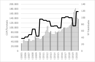 En la Fig. 9, se compara el precio del carbón [COP/Tonelada] con el número de fatalidades en el mismo periodo de tiempo, de acuerdo con esto, no es tan evidente la relación de estas variables, por ejemplo, mientras en 2019 se aumenta el número de fatalidades el precio de carbón disminuye.