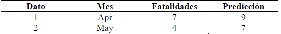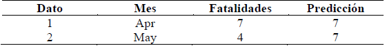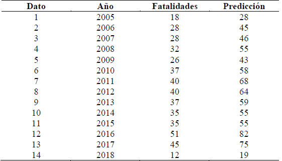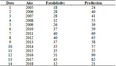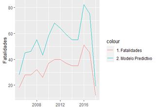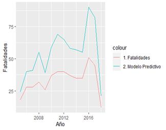 En la Fig. 10 se evidencia el modelo lineal (predictivo) y las fatalidades ocurridas; como se evidencia en esta gráfica, el modelo captura bien la tendencia, pero este tiende a sobreestimar el fenómeno.