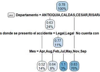 En la Fig. 11, se puede evidenciar un ejemplo de las iteraciones que tiene el modelo. Inicialmente el modelo considera el 100% de la información, posterior a ellos se presenta la primera regla lógica la cual es el departamento, donde se evidencia que el 24% de los datos pertenecen a Antioquia otorgando un valor de 0.63; en la siguiente regla lógica se establece el estado jurídico del título donde se presentó la emergencia, esta vez con el 24% de los datos como si este fuera el nodo raíz (un nuevo 100%) y así sucesivamente hasta finalizar todas las reglas lógicas.